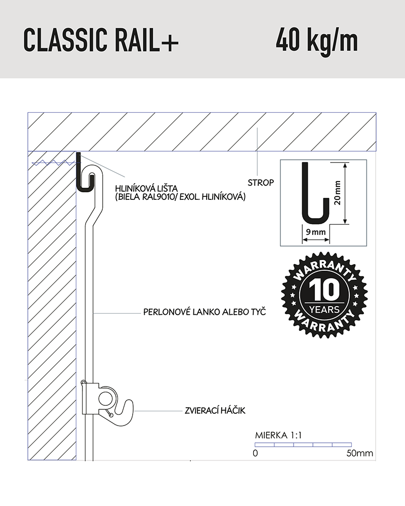 S lištou Classic Rail+ je možné použiť rôzne typy tyčí. Tyče s rozmermi 4×4 mm vyrobené z hliníka alebo ocele je možné kombinovať s rôznymi háčikmi, ktoré majú nosnosť od 20 do 40 kg.