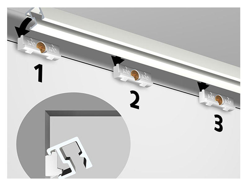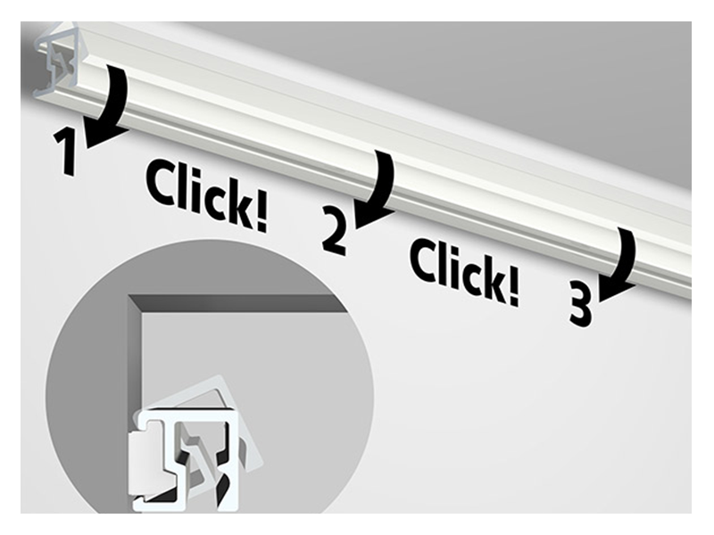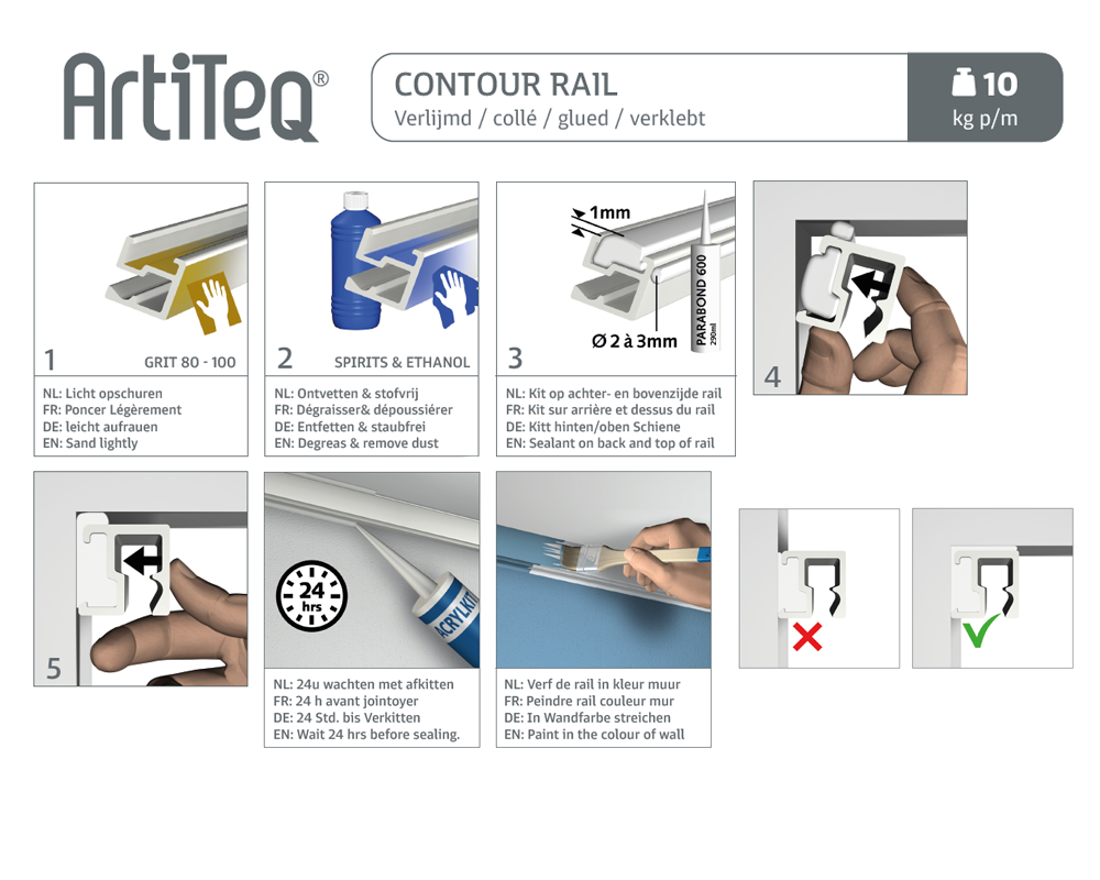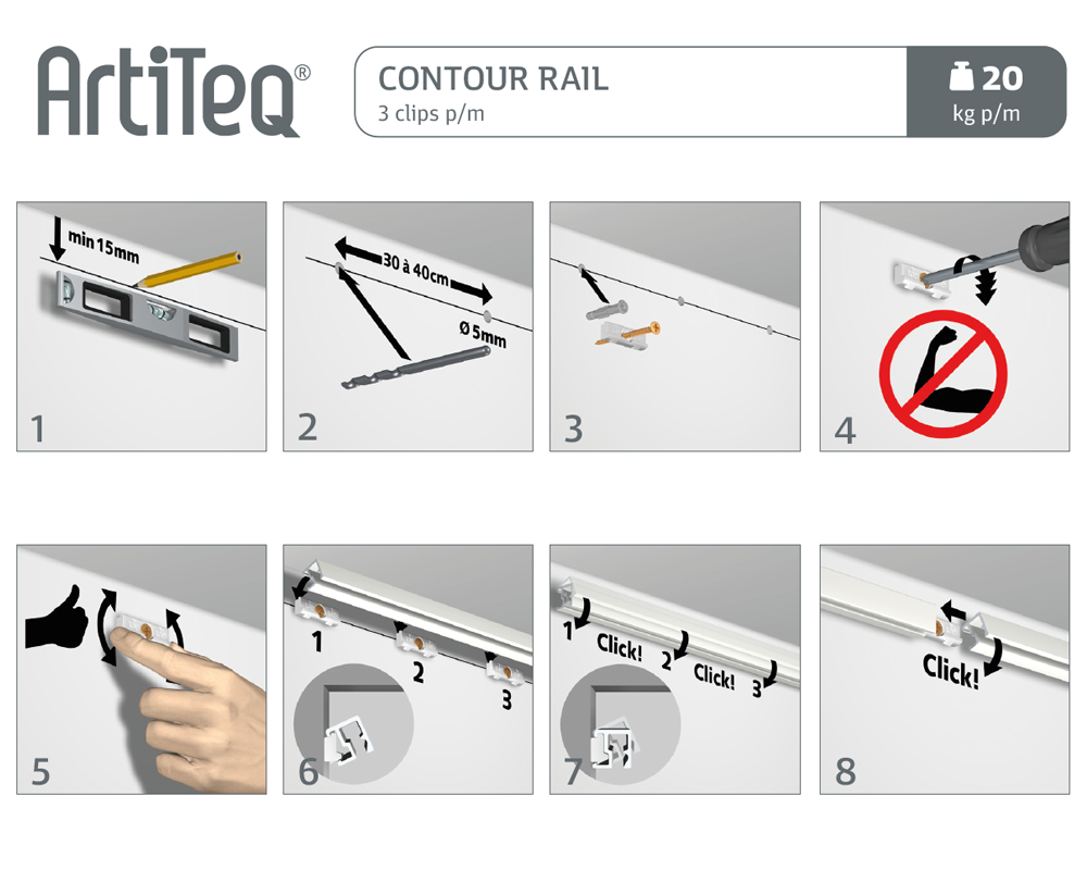 Systém Contour Rail dokonale plní svoju funkciu aj napriek minimálnym rozmerom a pýši sa atraktívnym, elegantným dizajnom. Vďaka lište Contour Rail je vešanie obrazov alebo presúvanie rámovaných fotografií hračkou. Pomocou klipov možno obrazové lišty jednoducho namontovať na stenu (minimálna vzdialenosť od stropu je 15 mm). Okrem hliníkovej verzie je k dispozícii aj biely model, ktorý je možné pretrieť akoukoľvek farbou.