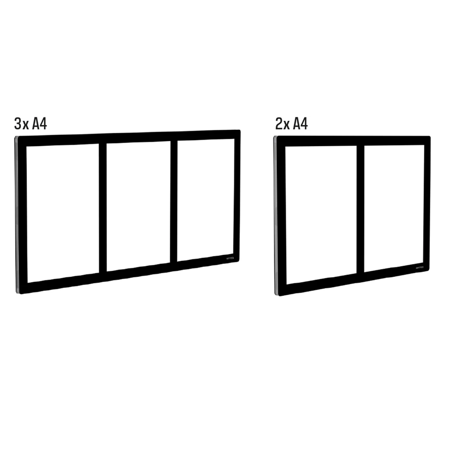 LED panely 3×A4: Pozostávajú z troch A4 panelov, ktoré sú prezentované ako jeden pevný celok – ideálne pre väčšie vizuály alebo sériu obrázkov komunikujúcich jeden jasný odkaz.