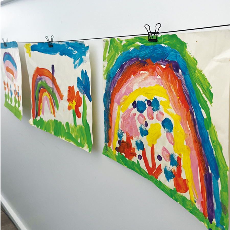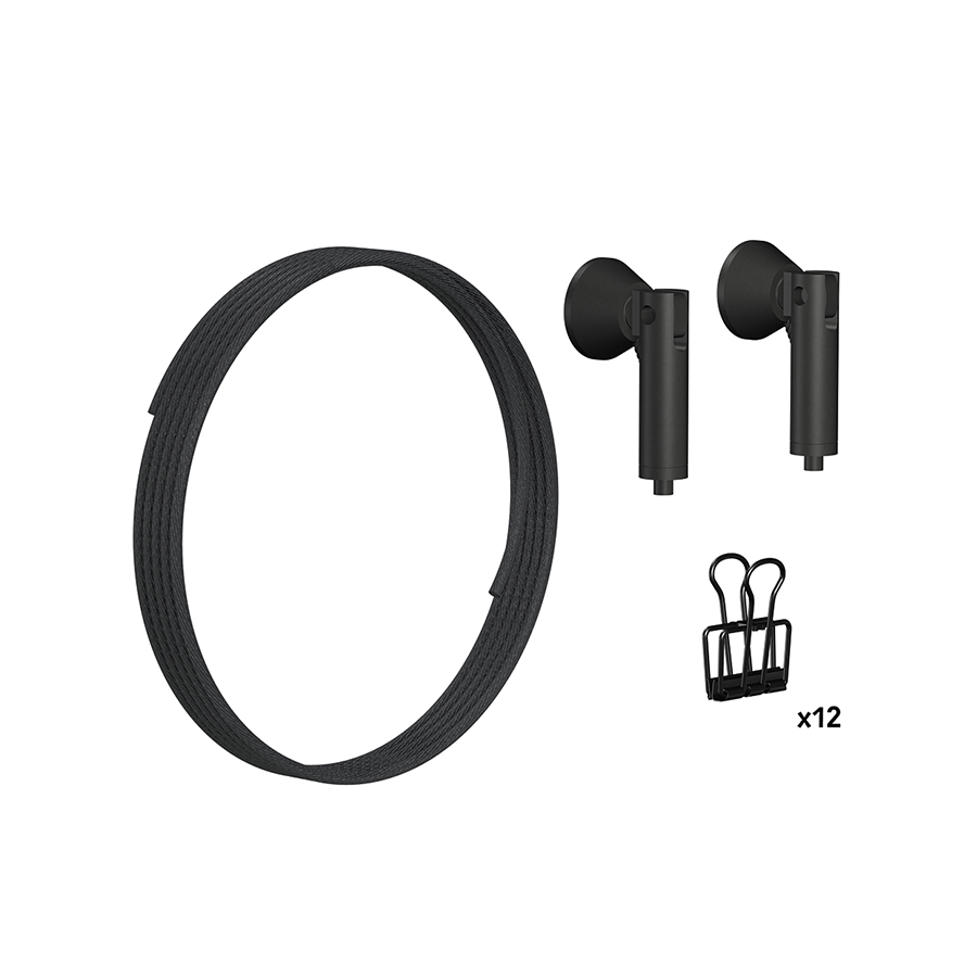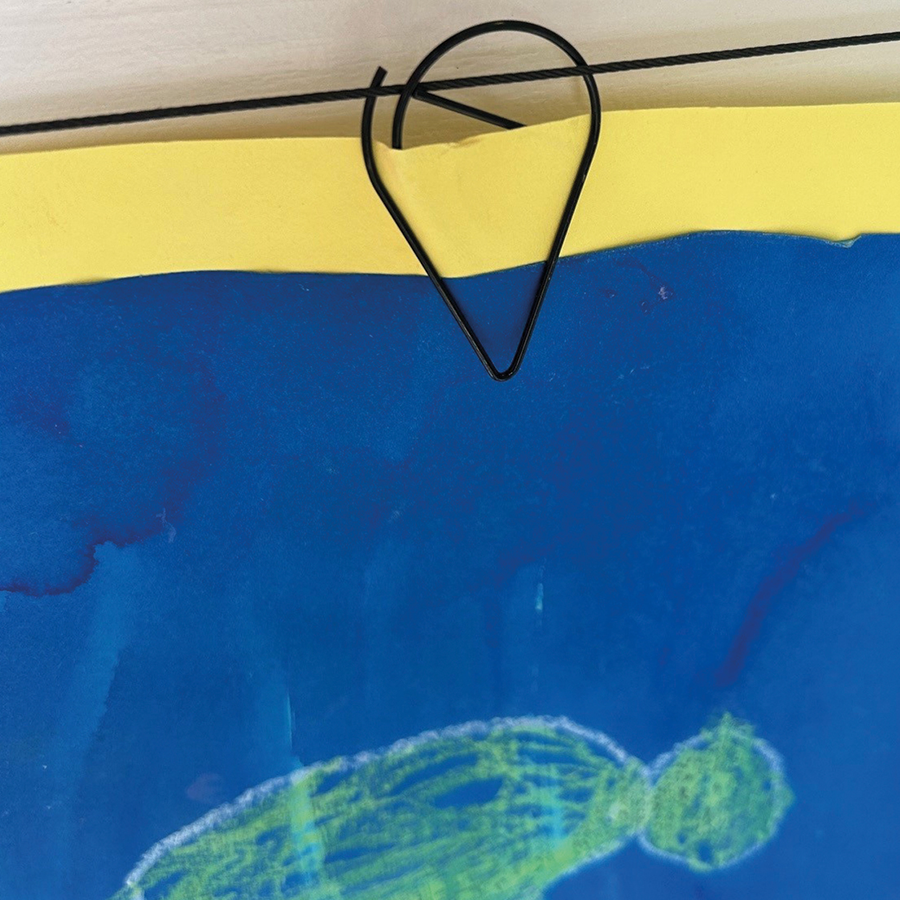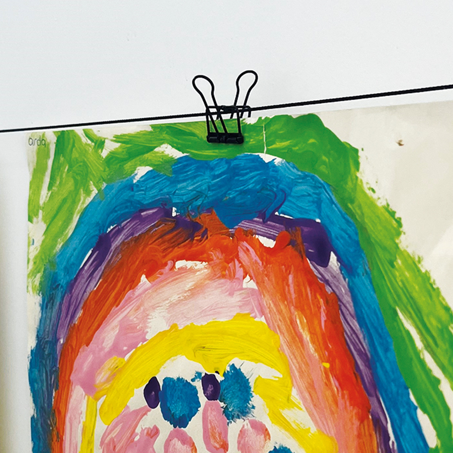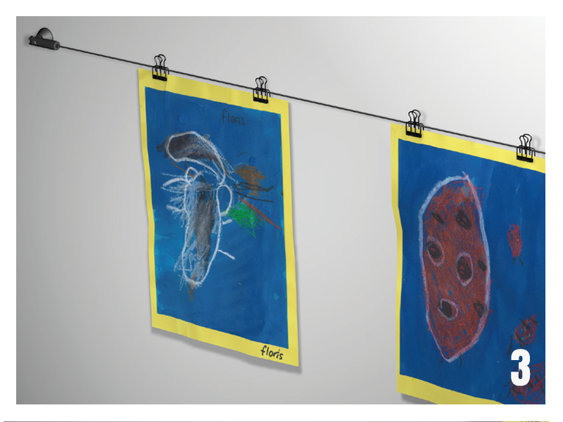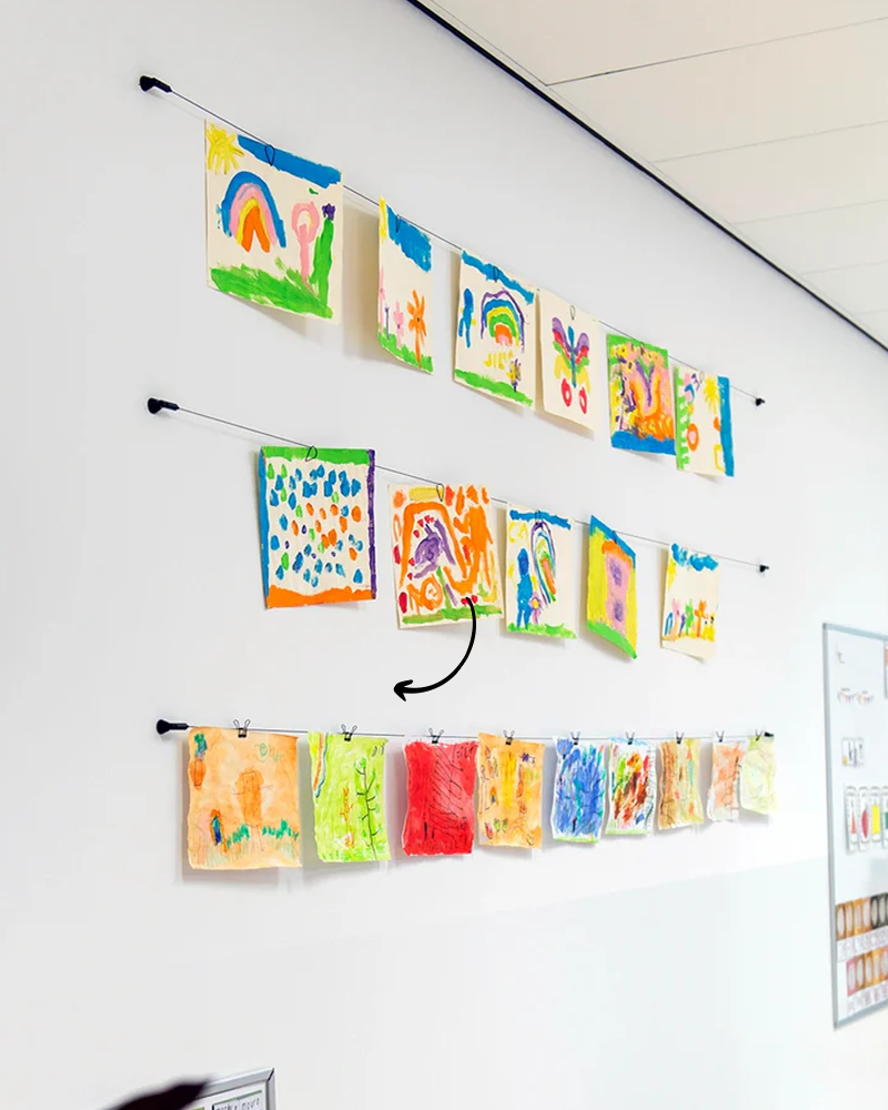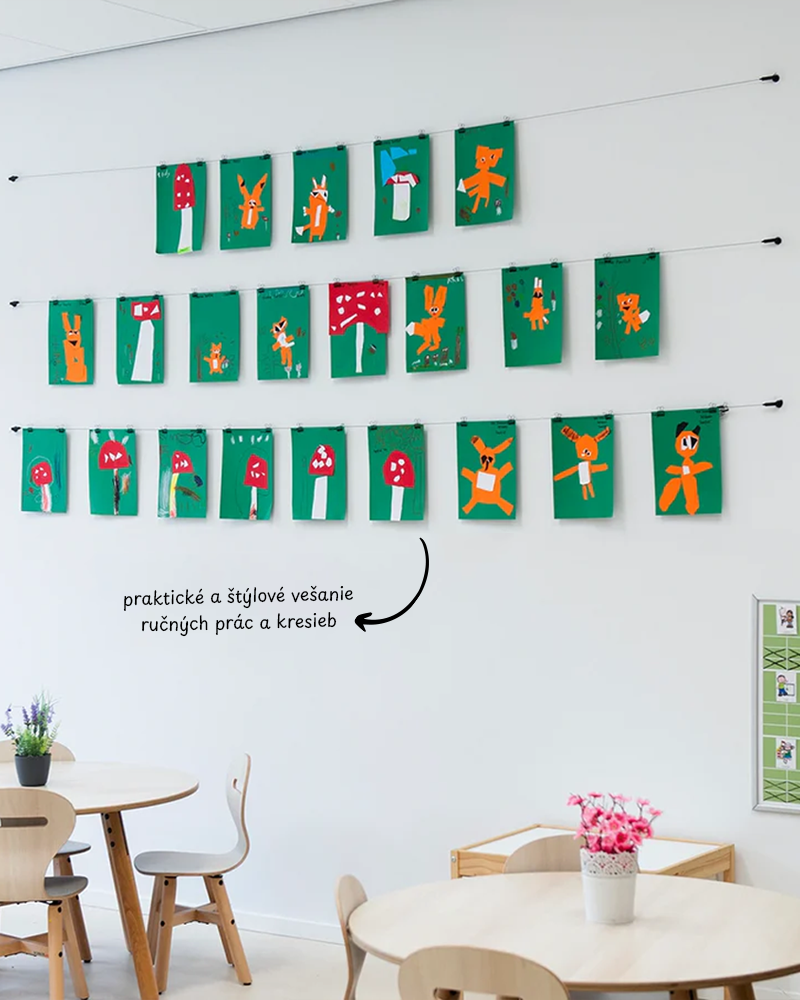 Čierne oceľové lanko je magnetické, čo umožňuje pripevniť kresby aj pomocou štýlových magnetov. Nástenný držiak upevnite v požadovanej výške a oceľové lanko pevne napnite. Tento systém je ideálny na použitie v učebniach alebo na školských chodbách, kde poskytuje praktický a štýlový spôsob vystavovania prác a dekorácií.