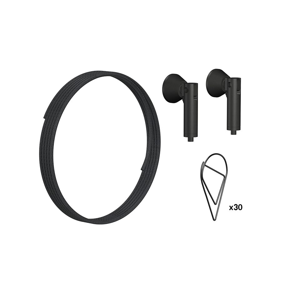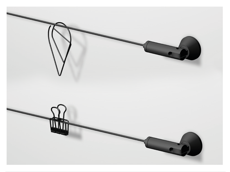 Pre horizontálne vešanie kresieb, plagátov, ručných prác, girlánd alebo iných dekorácií je táto súprava s napínacím lankom ideálnym riešením. Súprava obsahuje 300 cm dlhé čierne oceľové lanko s hrúbkou 1,2 mm, ktoré možno kombinovať s čiernymi sponkami v tvare kvapky alebo klasickými čiernymi sponkami na papier.