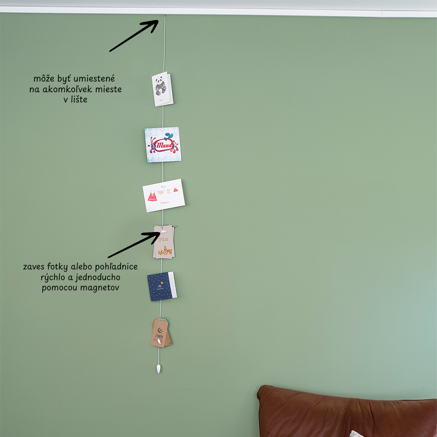Picture Mouse je praktické a originálne magnetické závesné lanko s dĺžkou 150 cm na prezentáciu kariet, fotografií a iných spomienok. Je to závesný systém, ktorý prakticky využíva steny v miestnosti.