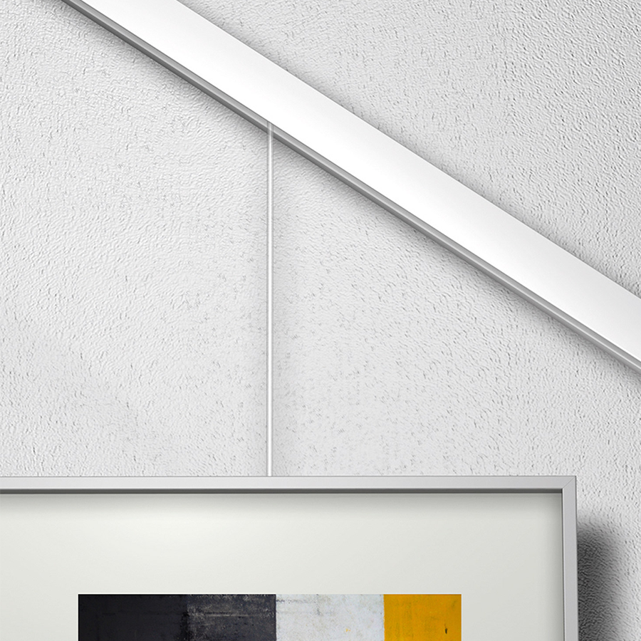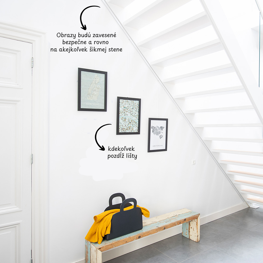 Sada dorazov pre šikmé steny (Stopper Set Slanting Walls) je špeciálny doplnok k flexibilným závesným systémom, ktorý umožňuje bezpečné zavesenie obrazov a dekorácií na steny so sklonom (napr. v podkroví alebo na schodiskách).