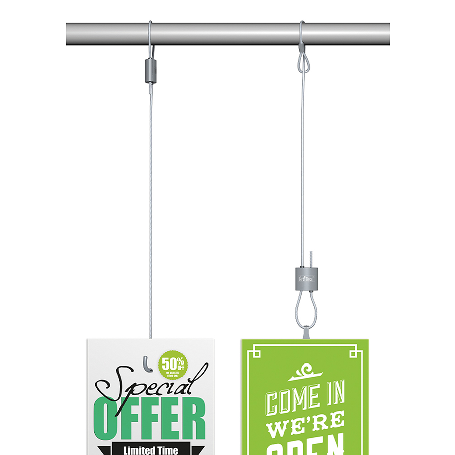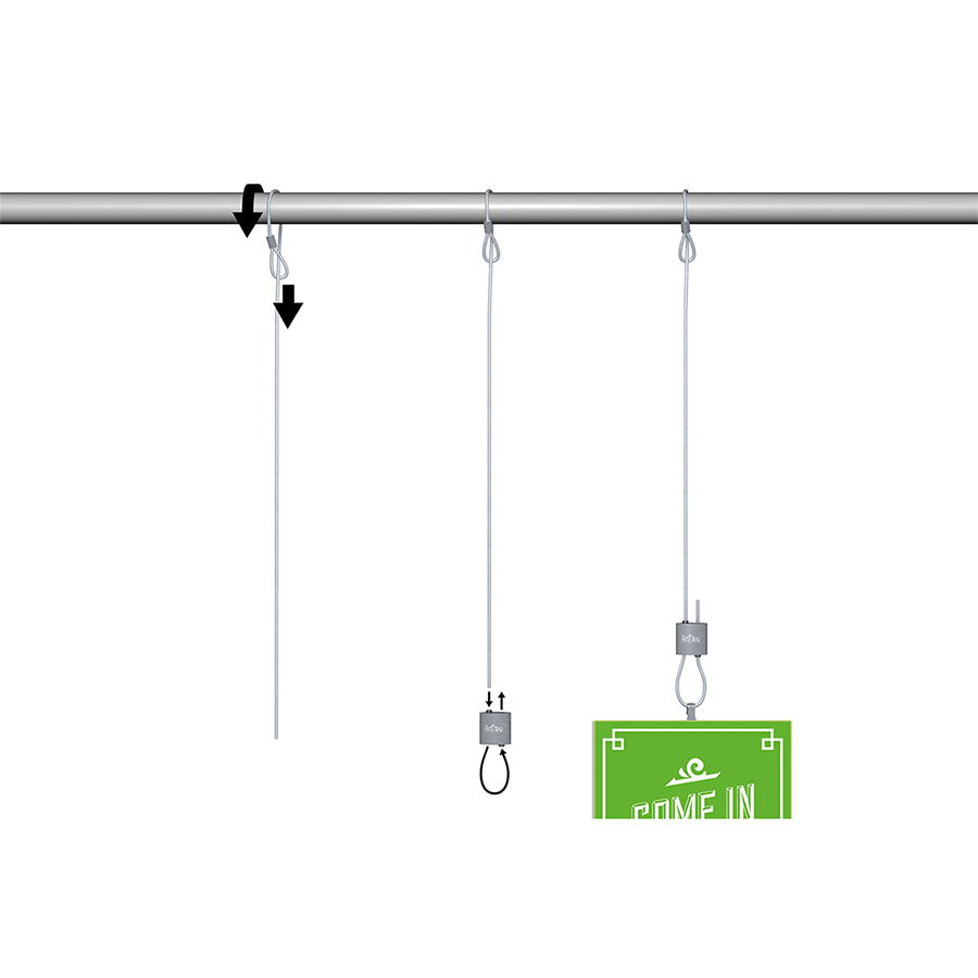 Je vybavený mechanizmom, ktorý v kombinácii s oceľovým lankom ponúka rýchle a praktické riešenie na vešanie rôznych predmetov. To zahŕňa nielen reklamné pútače alebo voľne visiace panely v priestore, ale aj priemyselnejšie prvky, ako sú káblové žľaby, potrubia, zapustené bodové svietidlá alebo dokonca podhľadové akustické ostrovy.