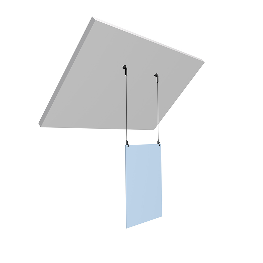 Závesný systém pre šikmé steny. Tento systém je navrhnutý na úhľadné a profesionálne zavesenie ľahkých panelov a značenia v budovách so šikmými stropmi a stenami. Špeciálny držiak na šikmé plochy výrazne uľahčuje inštaláciu týchto panelov.